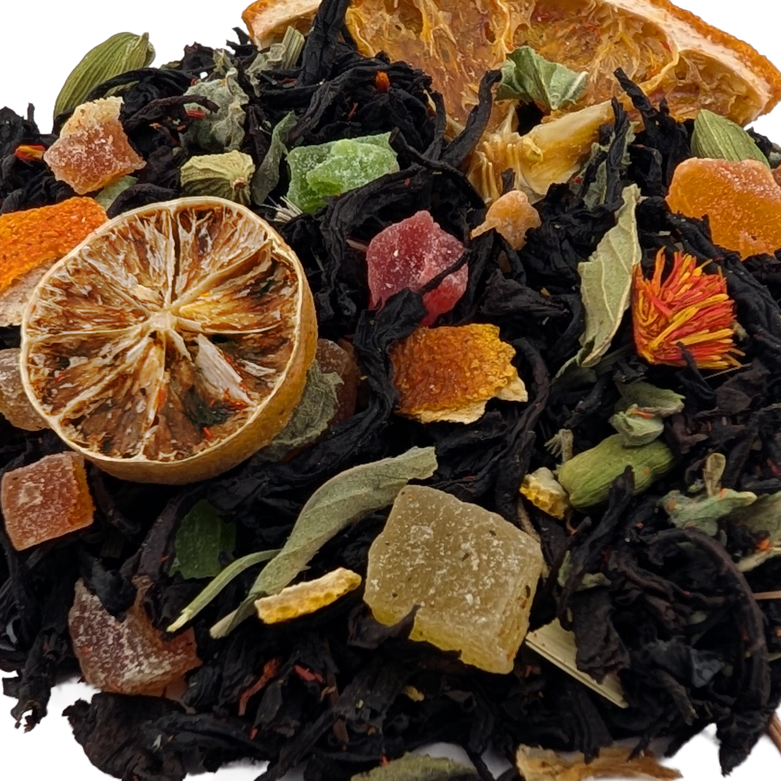 Пряный, фруктовый и невероятно освежающий взрыв вкусов! Насыщенная основа из черного Ассама служит идеальной базой для яркого карнавала: прохладной мяты и лемонграсса, микс различных цукатов. Лёгкие пряные ноты кардамона и цветков сафлора завершают этот сложный и бодрящий купаж.