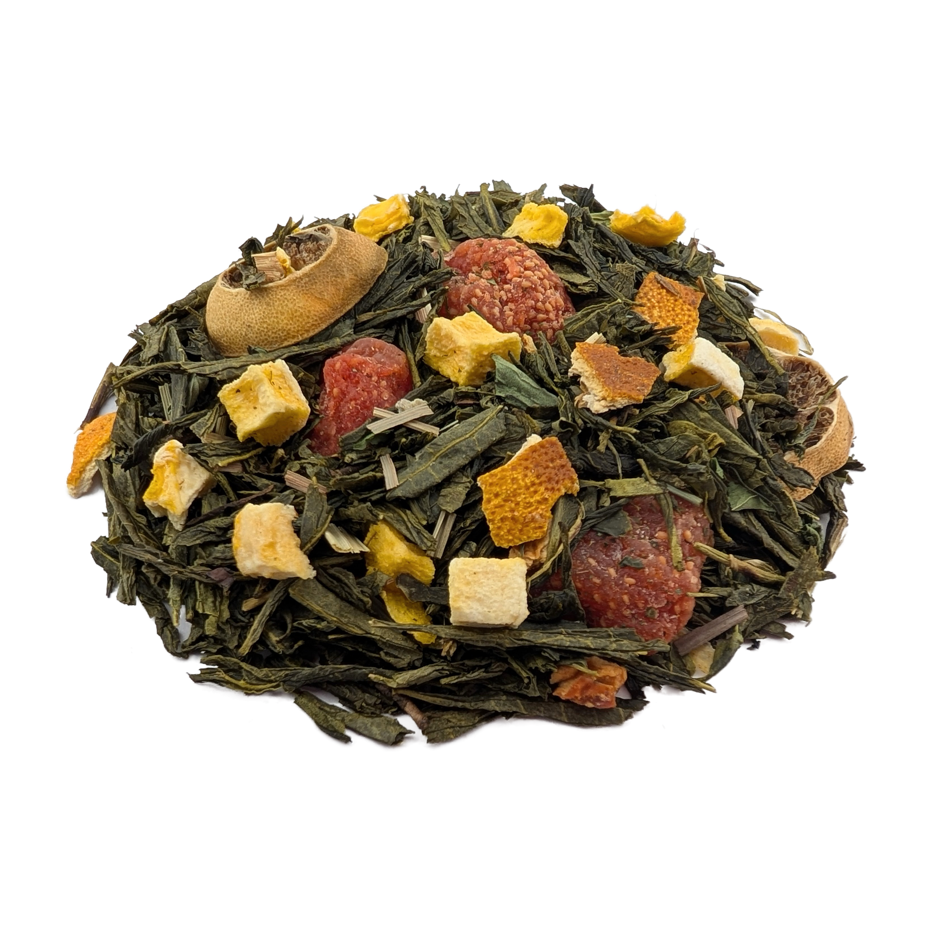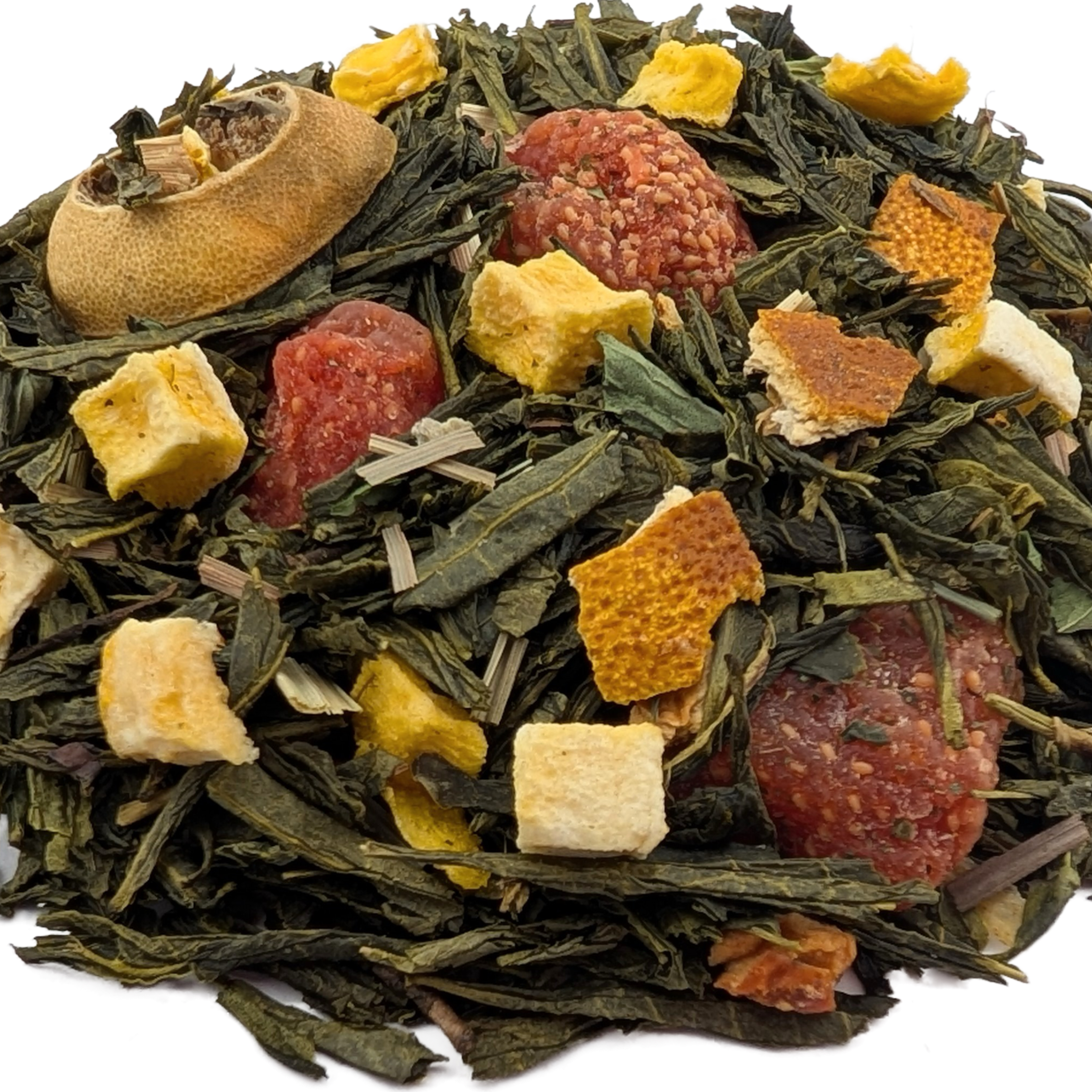Сочный, яркий и мгновенно освежающий! Лёгкая травянистая основа из зелёного чая Сенча взрывается каскадом вкусов: прохладной мятой и лемонграссом, цитрусовой кислинкой лайма, сладостью манго, яблока и клубники. Это настоящий безалкогольный мохито в вашей чашке — идеальный спутник жаркого дня.